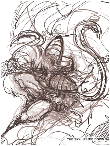 這一步我現在一般習慣在Sai里完成,起稿時可以先用一個淡的顏色把腦海里構思的圖大致勾出來,然后再用深一些的顏色進一步刻畫到自己滿意為止。(這步不用畫太細,自己能看懂就行了。)