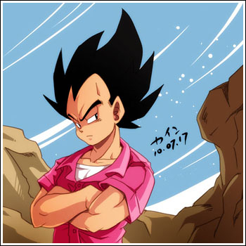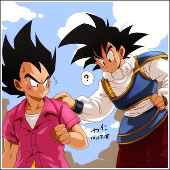 “還沒見過Vegeta不穿戰鬥服的樣子喲~便服也很可愛嘛(・∀・)……啊咧,背上寫的什麼?”